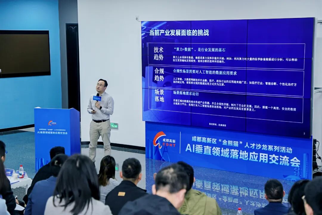 近日,成都高新区“金熊猫”人才沙龙系列活动:AI垂直领域落地应用交流在菁蓉汇成功举办。成都智算中心以“数据基石——构建可信数据空间与普惠算力赋能”为主题进行了分享,展现了在推动数据合规使用与AI产业融合方面的深刻洞察与实践成果。本次活动由成都高新区科技创新局主办,成都高新菁蓉汇智人才服务有限公司、成都高新人才发展促进会承办。活动聚焦人工智能在重点产业中的场景化落地,通过政策介绍、人才代表分享、人才项目路演等形式,搭建起“人才+技术+场景+资本”的交流对接平台。